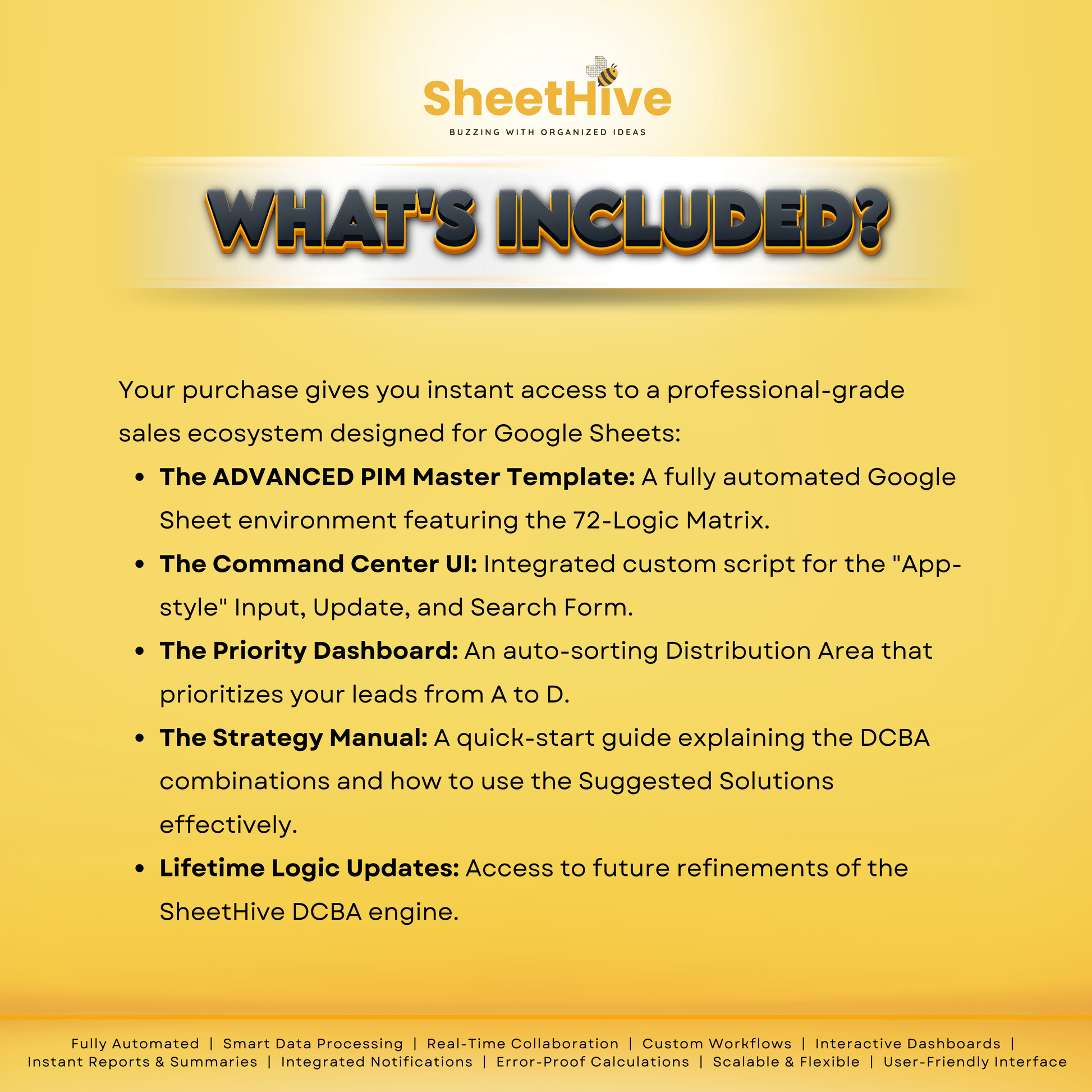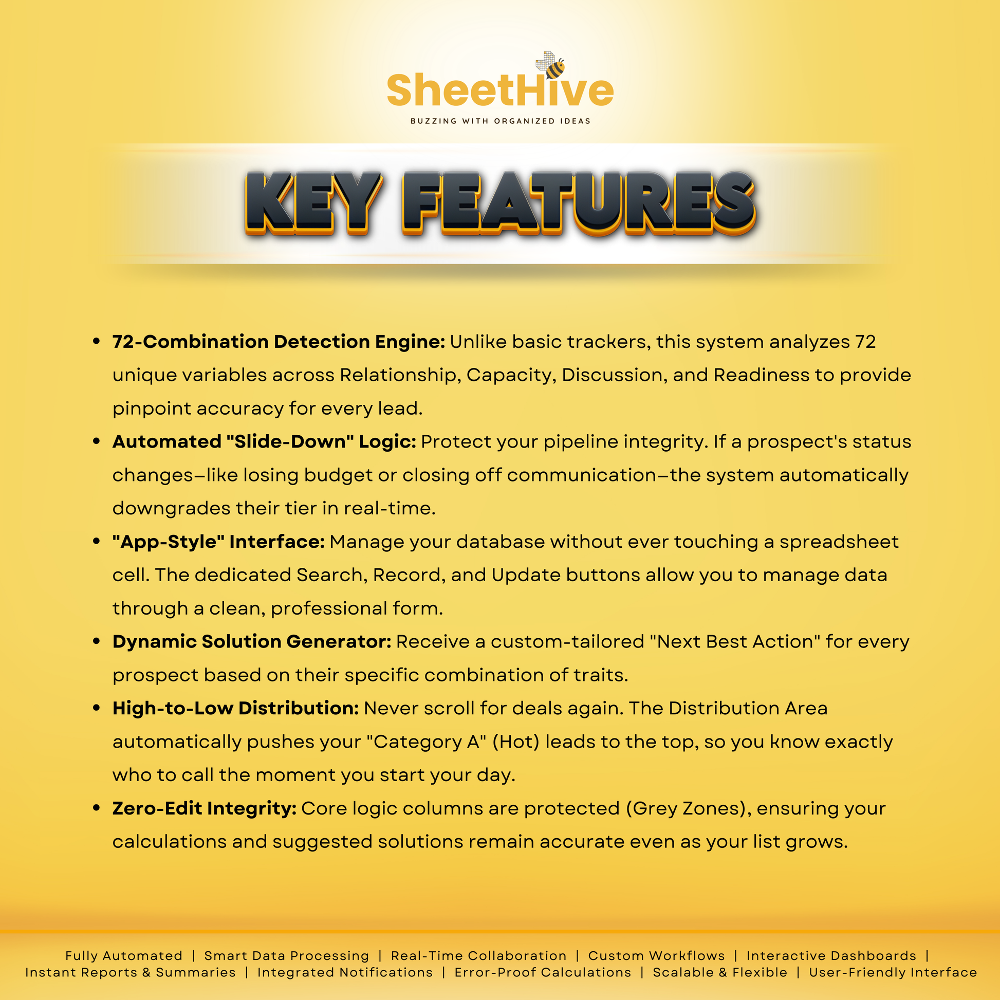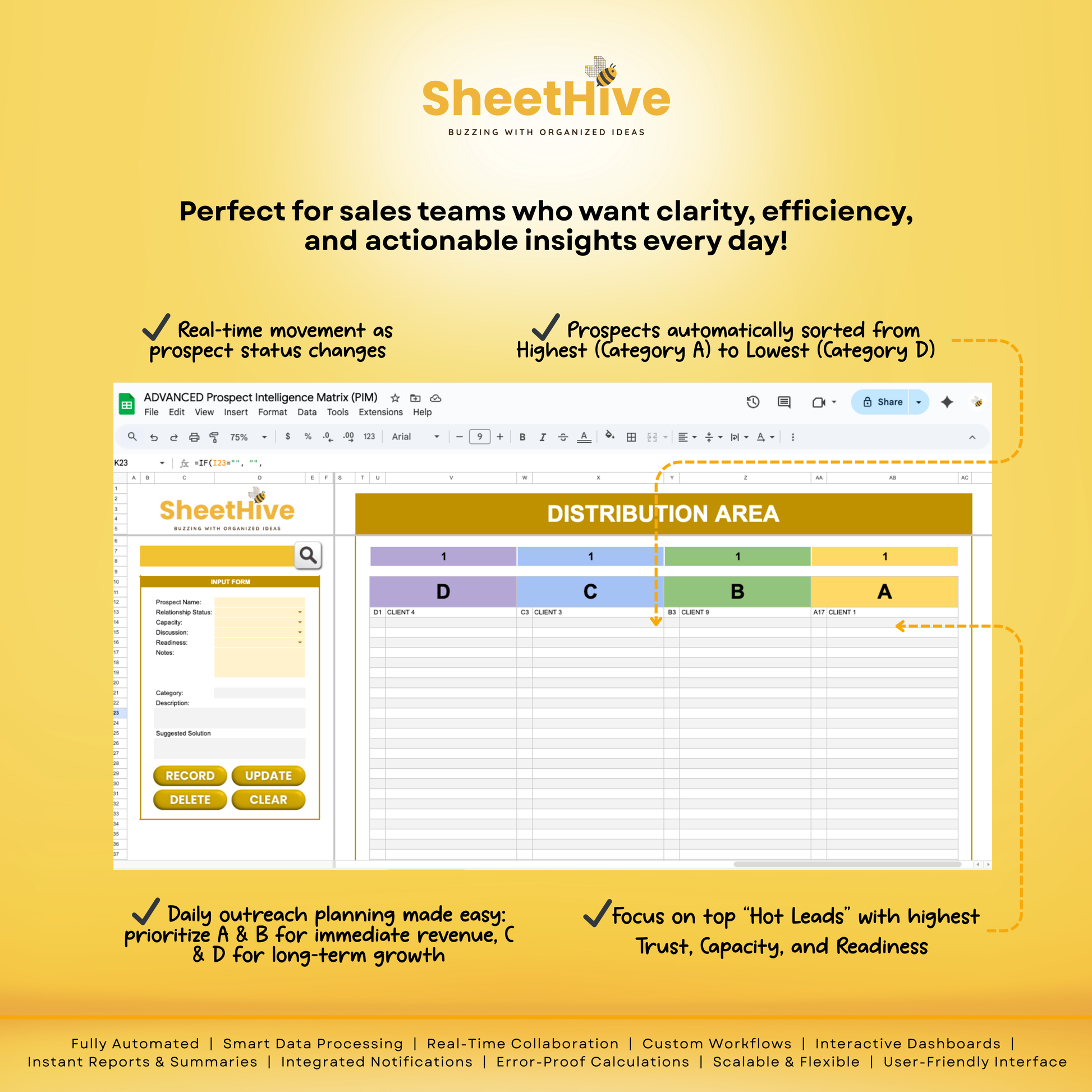 Stop guessing who to call. The ADVANCED PIM by SheetHive is a professional-grade CRM built in Google Sheets that turns messy lists into a high-converting sales engine. Using a proprietary 72-combination logic, it automatically analyzes your leads and ranks them from A (Hot) to D (Cold) based on trust, budget, and readiness.