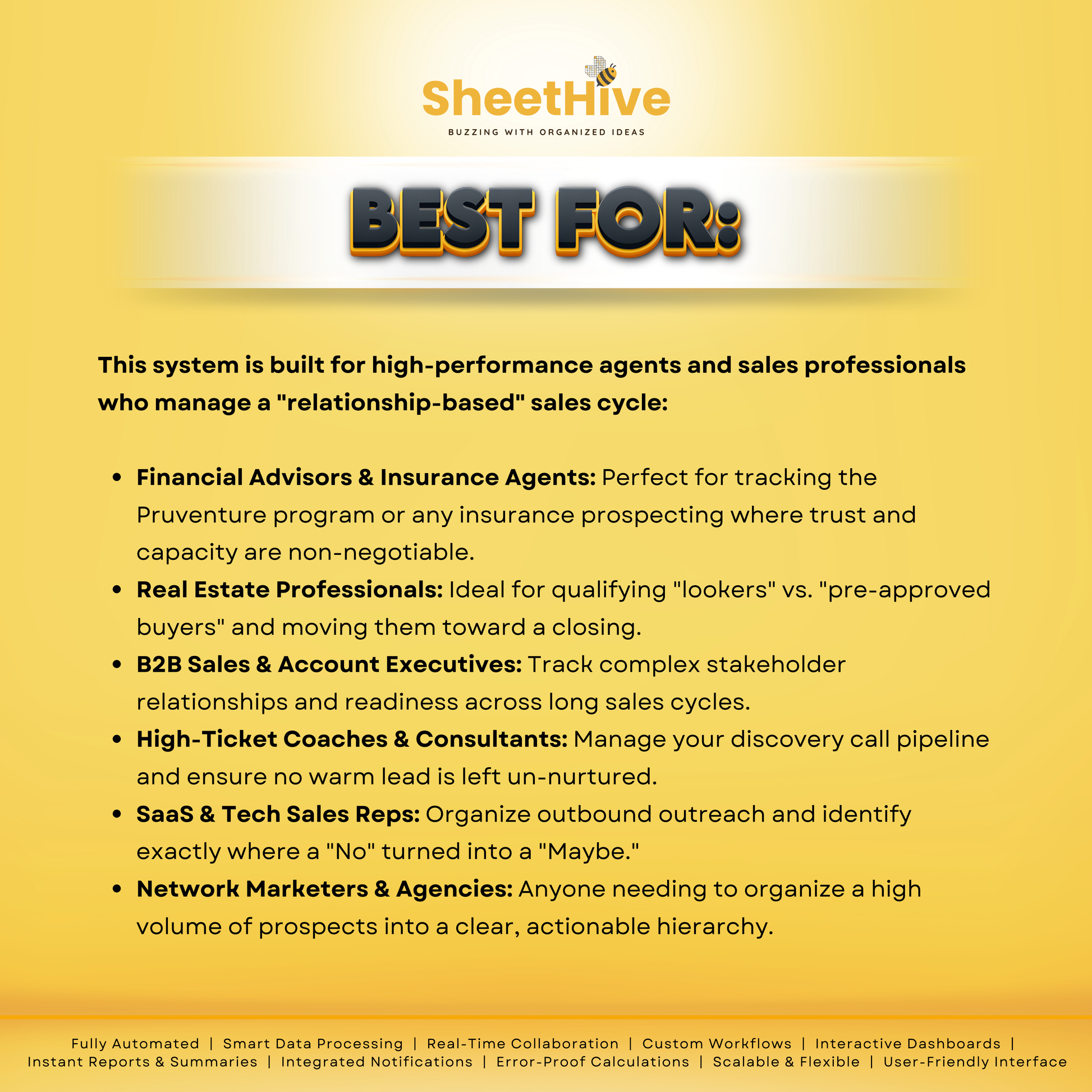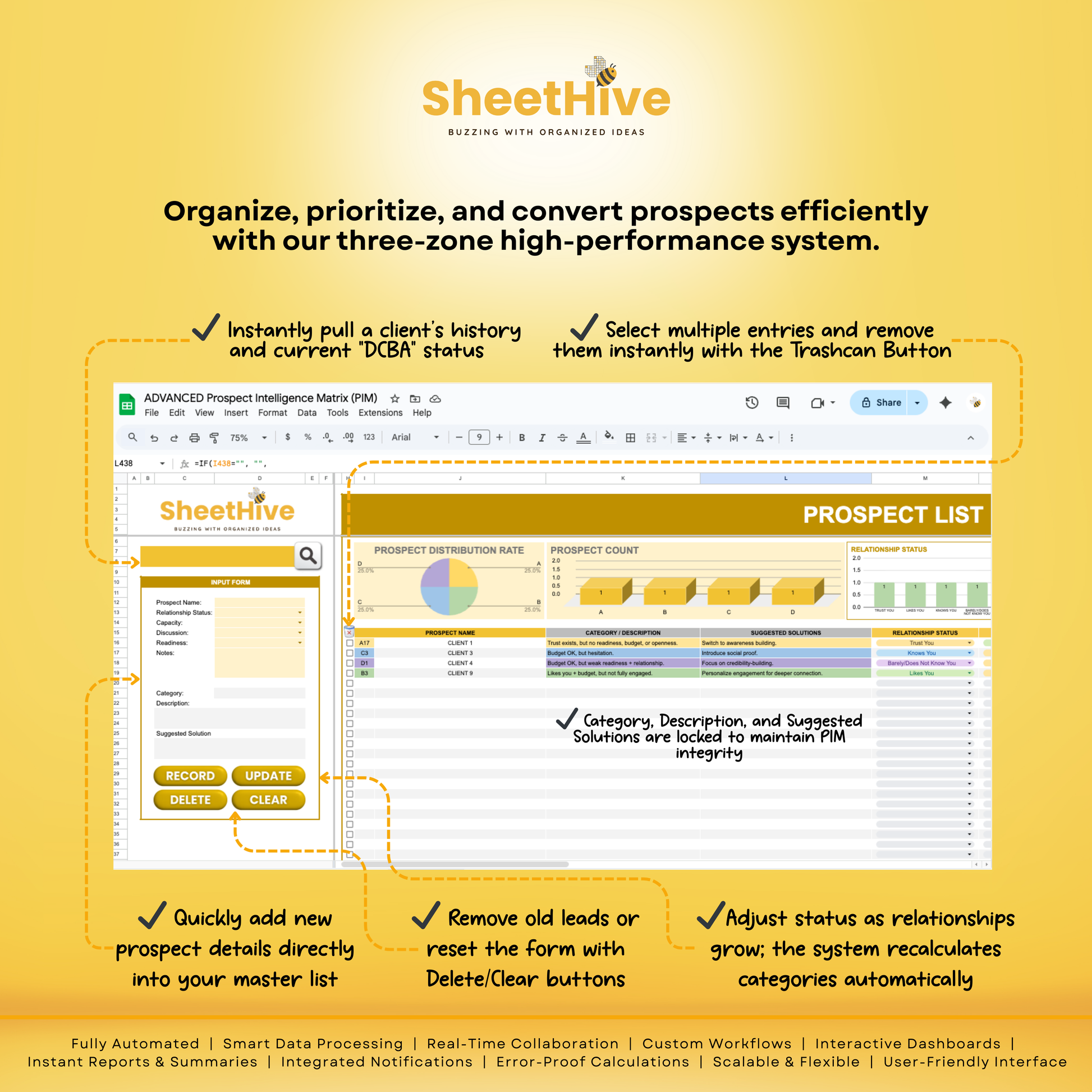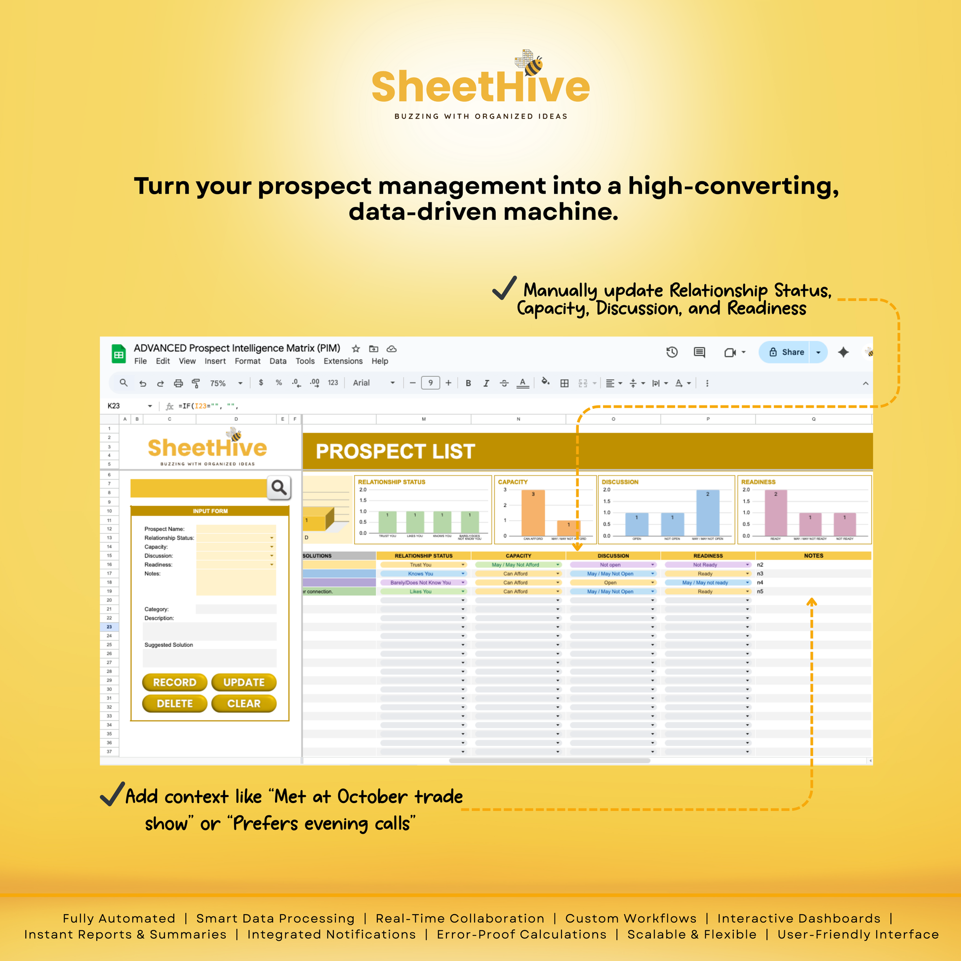 Stop guessing who to call. The ADVANCED PIM by SheetHive is a professional-grade CRM built in Google Sheets that turns messy lists into a high-converting sales engine. Using a proprietary 72-combination logic, it automatically analyzes your leads and ranks them from A (Hot) to D (Cold) based on trust, budget, and readiness.